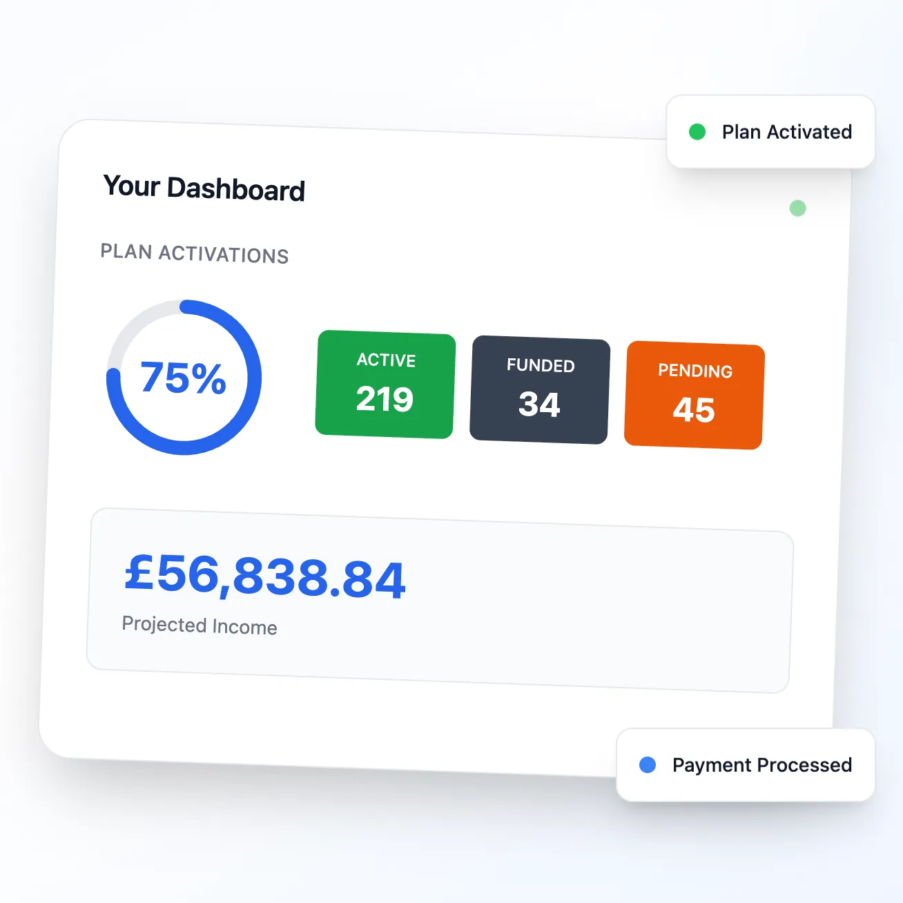 Monitor which plans are active, pending, or complete. Know exactly where every customer stands.